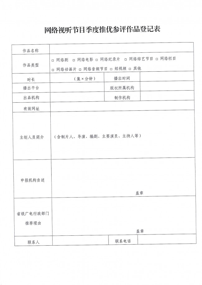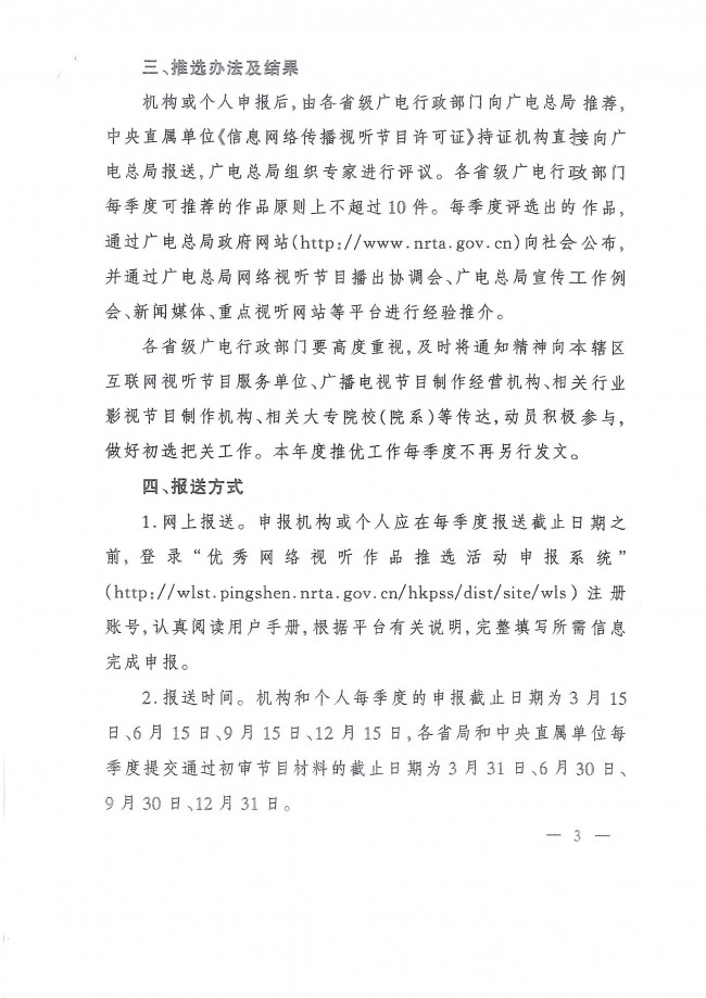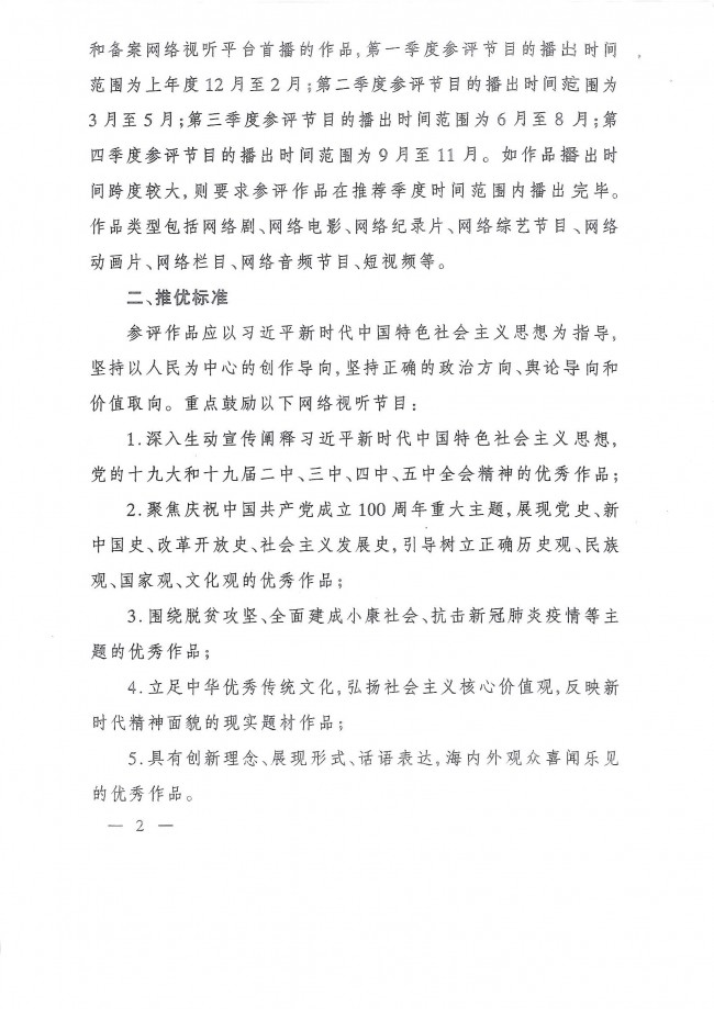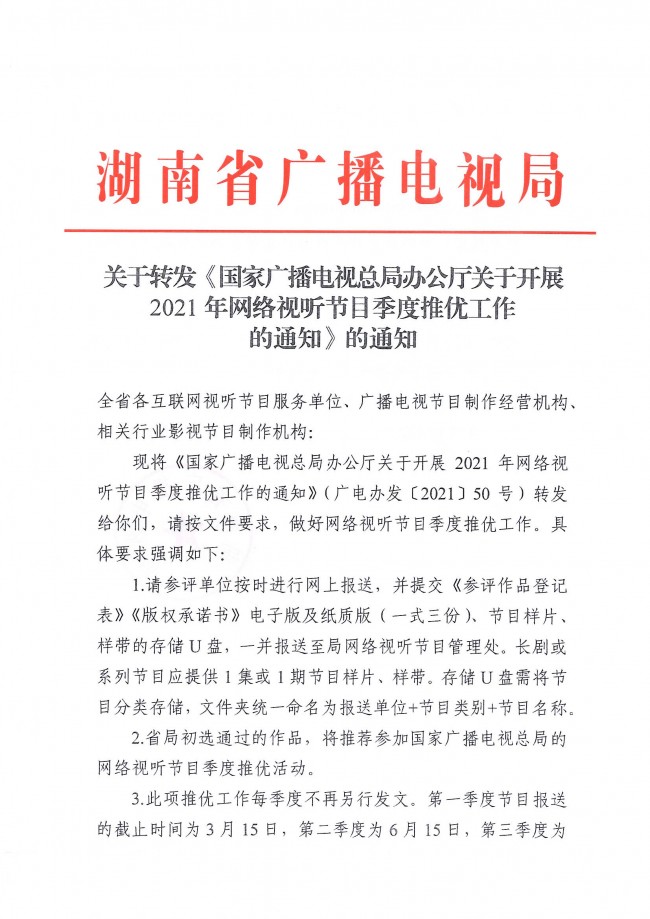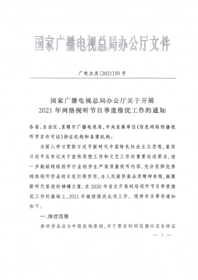 關(guān)于轉(zhuǎn)發(fā)《國(guó)家廣播電視總局辦公廳關(guān)于開(kāi)展2021年網(wǎng)絡(luò)視聽(tīng)節(jié)目季度推優(yōu)工作的通知》的通知