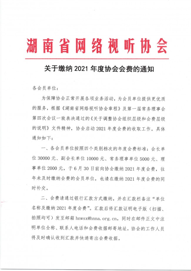 關(guān)于繳納 2021年度協(xié)會會費的通知