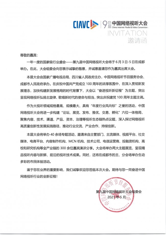 第九屆中國網(wǎng)絡視聽大會邀請函及參會須知