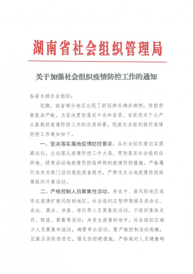 [重要通知]湖南省社會組織管理局《關(guān)于加強社會組織疫情防控工作的通知》