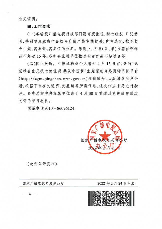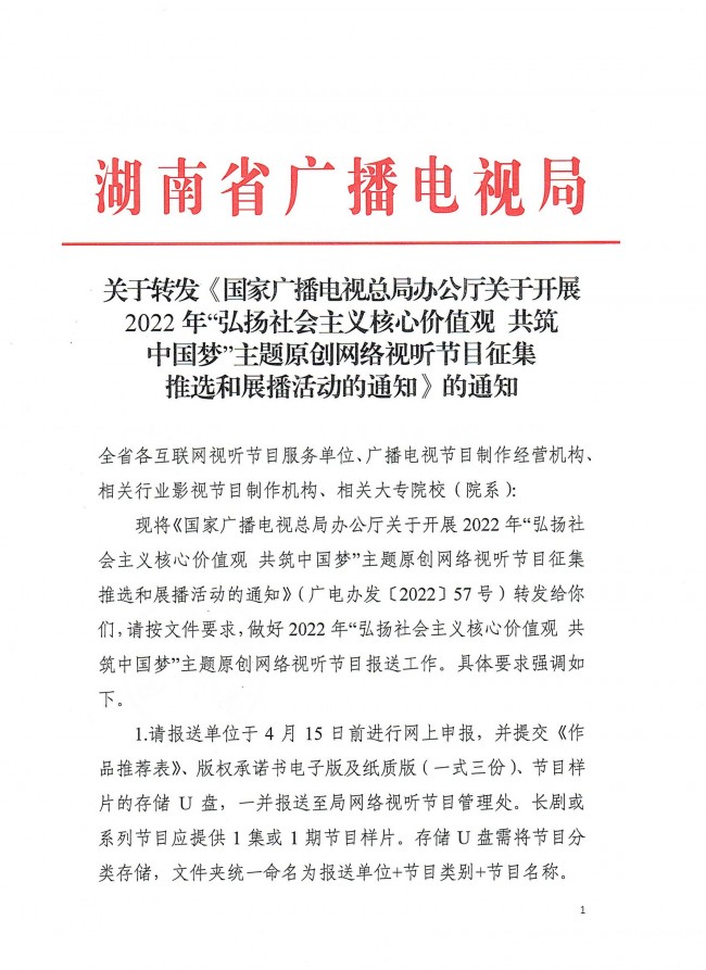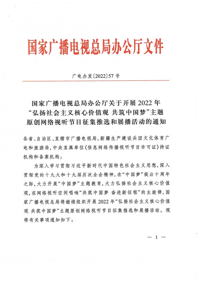 關(guān)于轉(zhuǎn)發(fā)《國家廣播電視總局辦公廳關(guān)于開展2022年“弘揚(yáng)社會(huì)主義核心價(jià)值觀 共筑中國夢(mèng)”主題原創(chuàng)網(wǎng)絡(luò)視聽節(jié)目征集推選和展播活動(dòng)的通知》的通知