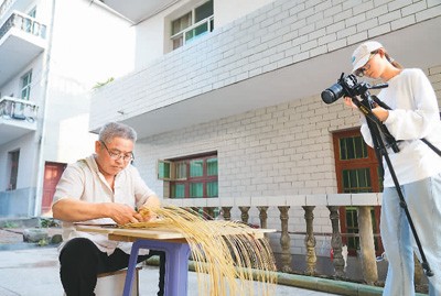 江西省新余市分宜縣洞村鄉(xiāng)竹編第五代傳人李年根,憑借拍攝竹編技藝的視頻迅速“出圈”,其短視頻平臺(tái)賬號(hào)吸引了上百萬粉絲。圖為團(tuán)隊(duì)攝影師拍攝李年根的工作畫面。新華社記者 周 密攝