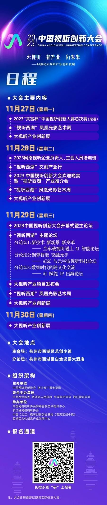 本屆大會(huì)由中國(guó)網(wǎng)絡(luò)視聽(tīng)協(xié)會(huì)、浙江省廣播電視局主辦,中共西湖區(qū)委、西湖區(qū)人民政府、中國(guó)美術(shù)學(xué)院、浙江音樂(lè)學(xué)院聯(lián)合主辦。據(jù)介紹,大會(huì)將舉辦開(kāi)幕式暨主論壇、2023“共富杯”中國(guó)視聽(tīng)創(chuàng)新大賽總決賽、大視聽(tīng)產(chǎn)業(yè)創(chuàng)新展、“視聽(tīng)西湖”主題論壇/產(chǎn)業(yè)推介會(huì)/文創(chuàng)產(chǎn)業(yè)行/鳳凰光影藝術(shù)周等豐富多彩的活動(dòng),涵蓋從AIGC、大模型到藝技融合、車載視聽(tīng)、智能直播、AI數(shù)字新場(chǎng)景、內(nèi)容出海、行業(yè)規(guī)范和監(jiān)管等產(chǎn)業(yè)鏈熱點(diǎn)和前沿課題。