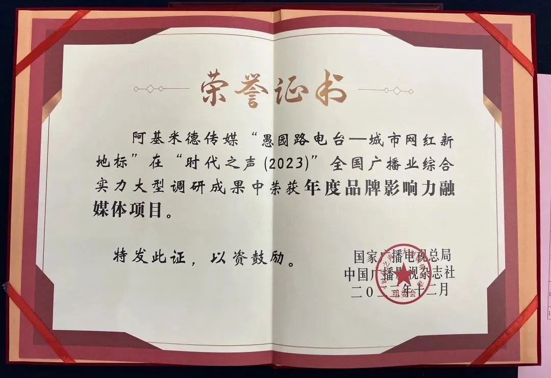 近日,阿基米德傳媒旗下“愚園路電臺(tái)——城市網(wǎng)紅新地標(biāo)”在“時(shí)代之聲(2023)”全國廣播業(yè)綜合實(shí)力大型調(diào)研成果中榮獲年度品牌影響力融媒體項(xiàng)目。