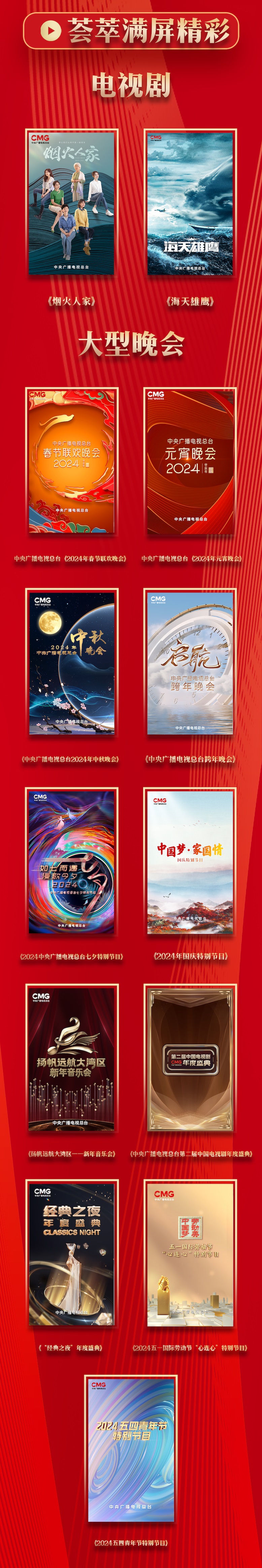 “薈萃滿屏精品”板塊匯聚全臺資源,優(yōu)中選優(yōu),呈現(xiàn)24部佳作。中央廣播電視總臺《2024年春節(jié)聯(lián)歡晚會》《中央廣播電視總臺第二屆中國電視劇年度盛典》《“經(jīng)典之夜”年度盛典》《2024五四青年節(jié)特別節(jié)目》等大型晚會,《中國書法大會》《詩畫中國·江河萬古流》等大型季播節(jié)目,《煙火人家》《海天雄鷹》等優(yōu)秀電視劇和《舌尖上的中國》《如果國寶會說話》等紀(jì)錄片專題片,全年接續(xù)呈現(xiàn),用滿屏精品陪伴觀眾度過春夏秋冬。