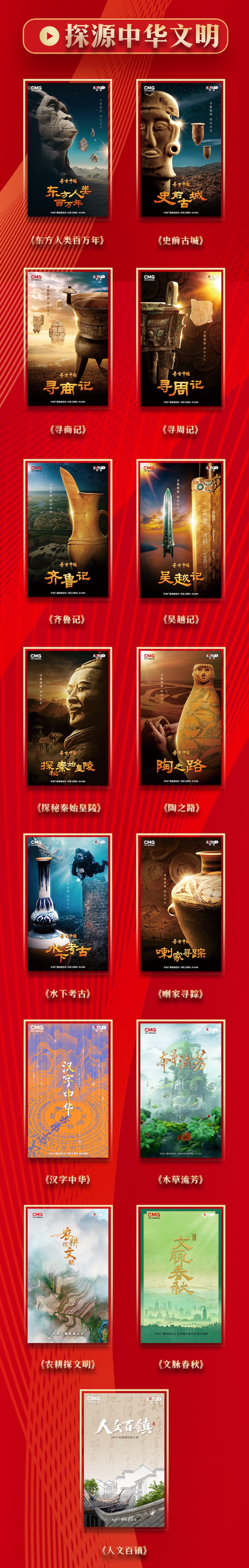 “探源中華文明”板塊推介15部大型系列紀(jì)錄片,勾勒文明發(fā)展脈絡(luò),探尋中華民族的自信之基、力量之源?!稏|方人類百萬年》從70多處史前人類化石遺址和伴生遺存實證中國是“東方人類的故鄉(xiāng)”;《史前古城》展現(xiàn)先民們“規(guī)劃”家園,進行社會分化的歷史景象;《尋商記》透過多座商代都城遺址洞悉商王朝面貌及歷史影響;《尋周記》走進周原考古現(xiàn)場,呈現(xiàn)周文化的真相、內(nèi)涵與深刻意義;《齊魯記》探尋齊魯大地以實物書寫中華禮樂文明,見證在中華文明多元一體的演進歷程等方面發(fā)揮的重要作用;《吳越記》探索江海吳越的古國文明與璀璨歷史;《探秘秦始皇陵》用最新技術(shù)手段揭示陵墓秘密,反映秦時期人民的偉大創(chuàng)造;《陶之路》跟隨陶器的演變,帶領(lǐng)觀眾了解古陶背后的文化內(nèi)涵以及華夏的文明基因;《水下考古》通過水下考古和科技考古的手段,探秘海洋深處蘊含的中國古代商貿(mào)文明;《喇家尋蹤》講述4000年前喇家聚落的神秘故事;《漢字中華》打造三維倉頡實驗室,探尋漢字基因密碼,展現(xiàn)東方文化的神韻和魅力;《本草流芳》從考古發(fā)現(xiàn)、典籍記載、民俗傳承、藥食同源等維度展現(xiàn)中華民族的健康養(yǎng)生理念。《農(nóng)耕探文明》《文脈春秋》《人文百鎮(zhèn)》等大型系列紀(jì)錄片從農(nóng)業(yè)文化遺產(chǎn)、文化傳承保護、特色名鎮(zhèn)視角講述中華文明上下五千年的燦爛輝煌。