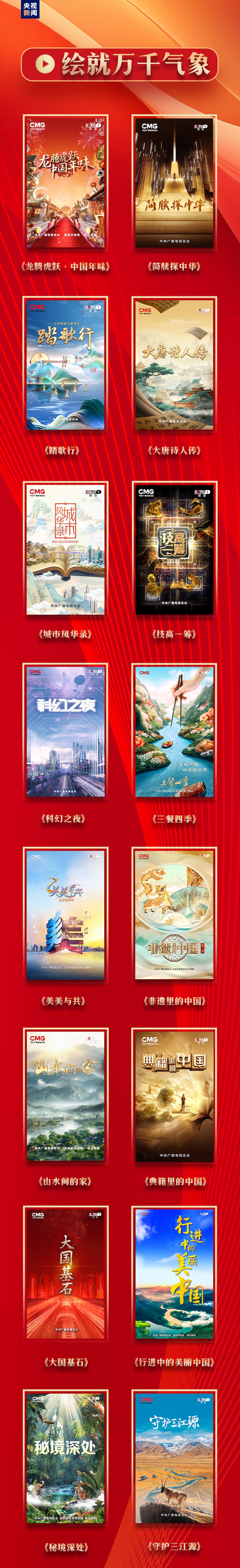 “繪就萬千氣象”板塊共推介了16檔節(jié)目。全新推出系列大型季播節(jié)目,從傳統(tǒng)文化、城市文旅等角度展現(xiàn)了生生不息的歷史文脈和中國式現(xiàn)代化偉大實踐的壯麗圖景:《大唐詩人傳》以“沉浸式實景演繹+電影化拍攝+XR呈現(xiàn)”的創(chuàng)新模式,首次講述李白、杜甫、王維等11位大唐詩人跌宕傳奇的人生故事;《踏歌行》通過別開生面的詩詞之旅,帶領(lǐng)觀眾了解詩歌背后的歷史背景和文化內(nèi)涵;《城市風(fēng)華錄》以地域文化為脈絡(luò),展現(xiàn)中國城市文明新形態(tài);《技高一籌》聚焦高科技技能在各領(lǐng)域的創(chuàng)新應(yīng)用,彰顯青年高技能人才自強不息的攀登精神;《科幻之夜》聚焦太空探秘、人工智能、量子科技等尖端科技領(lǐng)域的探索與成就;《三餐四季》帶領(lǐng)受眾品味地方特色美食、領(lǐng)略一方風(fēng)土人情,呈現(xiàn)各地火熱的社會生活面貌。大型春節(jié)系列特別節(jié)目《龍騰虎躍·中國年味》以“城市漫游+文物探訪+文藝表演”的方式探尋傳統(tǒng)文化中的春節(jié)習(xí)俗,詮釋中國人民對幸福生活的追求。紀(jì)錄片《行進中的美麗中國》以綠色家園創(chuàng)建者的視角,展現(xiàn)生態(tài)環(huán)境的變化和人民的幸福生活;《秘境深處》深入?yún)擦置鼐?、探尋中華水源,講述人與自然的和諧共生之美;《守護三江源》展示法治力量的威嚴(yán),講述人們自覺參與守護自然的故事?!逗啝┨街腥A》《典籍里的中國》《山水間的家》《非遺里的中國》《美美與共》《大國基石》等品牌節(jié)目也將持續(xù)推新。