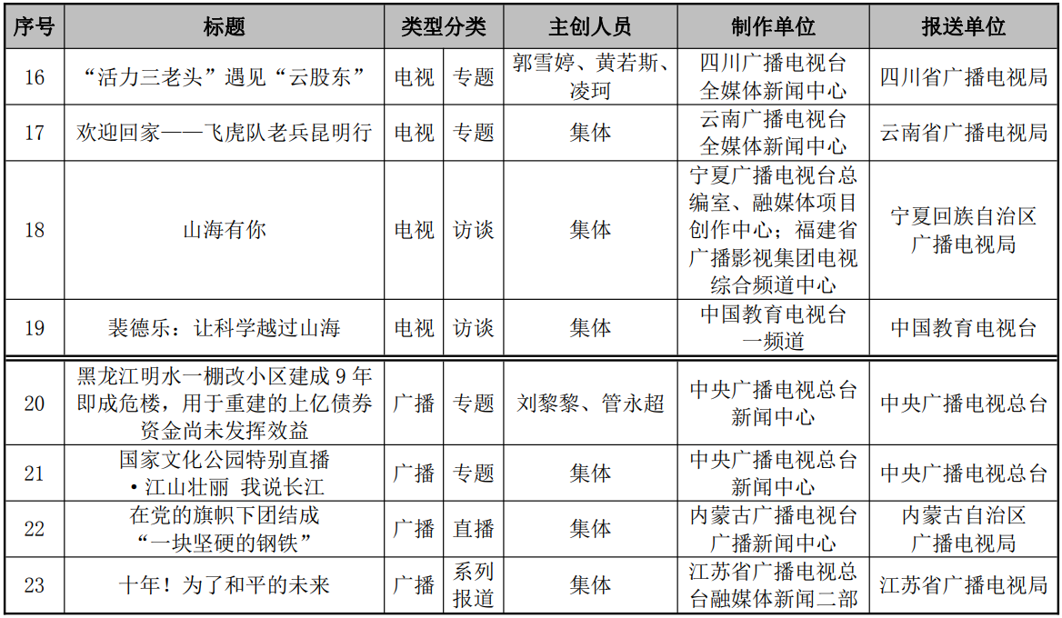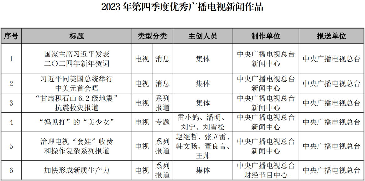 為深入學(xué)習(xí)宣傳貫徹習(xí)近平新時代中國特色社會主義思想,充分發(fā)揮優(yōu)秀廣播電視新聞作品的示范引導(dǎo)效應(yīng),提升新聞報道水平,國家廣播電視總局日前組織業(yè)內(nèi)專家及廣播電視采編一線代表對2023年第四季度優(yōu)秀廣播電視新聞作品進行了評審,從全國選送的174件新聞作品中,遴選出25件優(yōu)秀廣播電視新聞作品,現(xiàn)予公布。