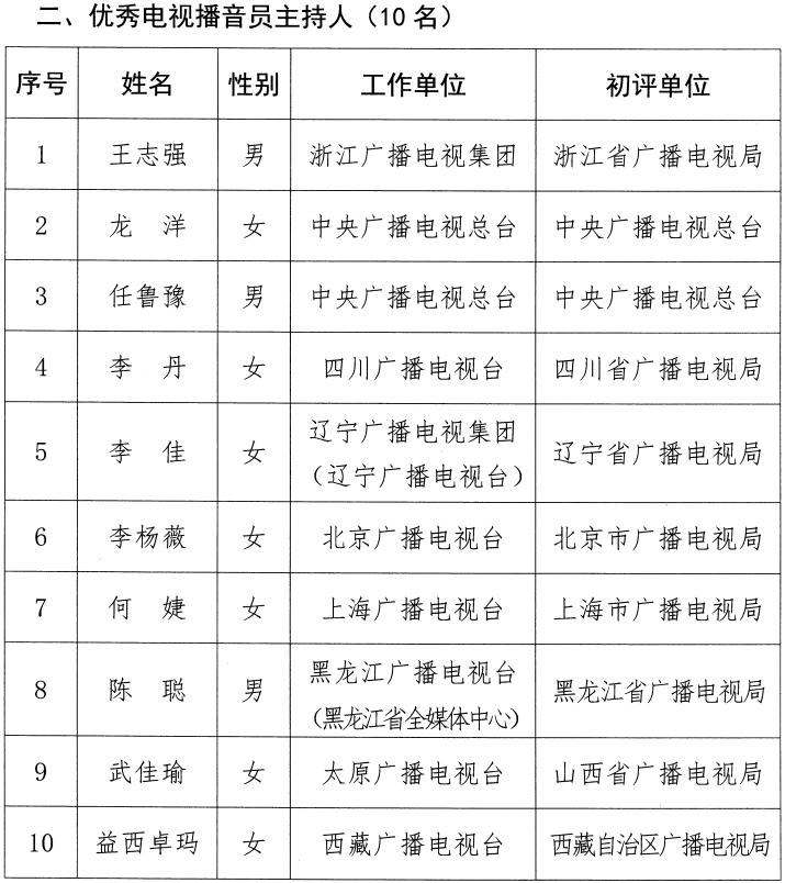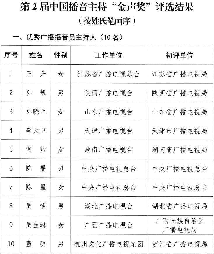 中國廣播電視節(jié)目獎·中國播音主持“金聲獎”是經(jīng)中央批準、我國播音主持領(lǐng)域設(shè)立的政府獎。第2屆“金聲獎”經(jīng)過初評、復評和終評,評選出優(yōu)秀廣播播音員主持人、優(yōu)秀電視播音員主持人各10名?,F(xiàn)將評選結(jié)果予以公示,公示期為2024年3月12日至3月18日。如有異議,請于公示期內(nèi)向“金聲獎”評委會辦公室反映,逾期不予受理。