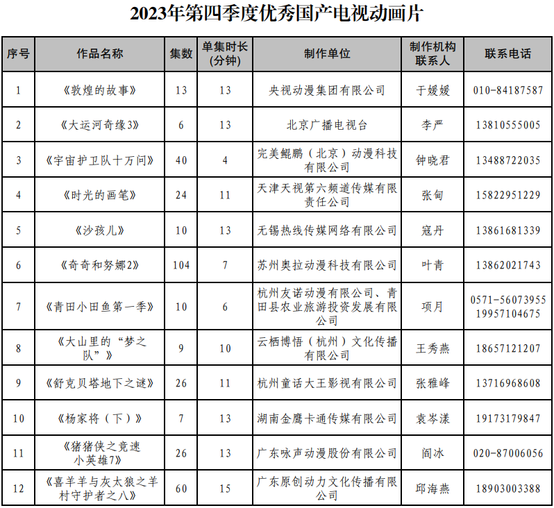 為充分發(fā)揮優(yōu)秀電視動(dòng)畫片示范帶動(dòng)作用,繁榮國產(chǎn)動(dòng)畫創(chuàng)作生產(chǎn),經(jīng)省級(jí)廣播電視行政部門、中央廣播電視總臺(tái)辦公廳推薦,廣電總局組織專家評(píng)審,確定《敦煌的故事》《時(shí)光的畫筆》《大山里的“夢之隊(duì)”》等12部作品為2023年第四季度優(yōu)秀國產(chǎn)電視動(dòng)畫片。這些作品堅(jiān)持正確導(dǎo)向和價(jià)值引領(lǐng),聚焦主題主線,弘揚(yáng)社會(huì)主義核心價(jià)值觀,弘揚(yáng)中華優(yōu)秀傳統(tǒng)文化,具有較強(qiáng)的思想性、藝術(shù)性。請各級(jí)廣播電視行政部門向所轄各級(jí)電視臺(tái)傳達(dá)通知,全國各級(jí)電視臺(tái)特別是上星綜合頻道、動(dòng)畫頻道、少兒頻道可予以優(yōu)先安排播出。
