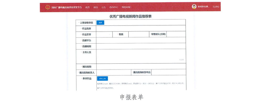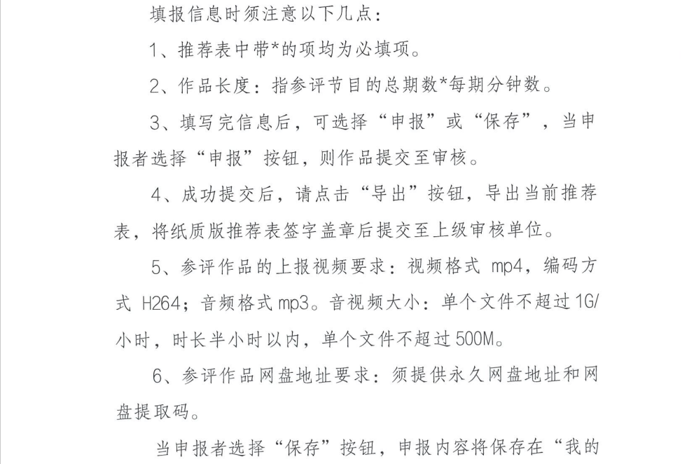 1.網(wǎng)上申報(bào)。通過“國家廣播電視總局評審評獎(jiǎng)平臺”(http://xcs.pingshen.nrta.gov.cn)完成申報(bào),操作方法見申報(bào)手冊(見附件)。