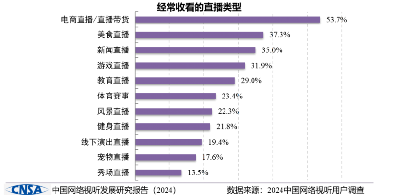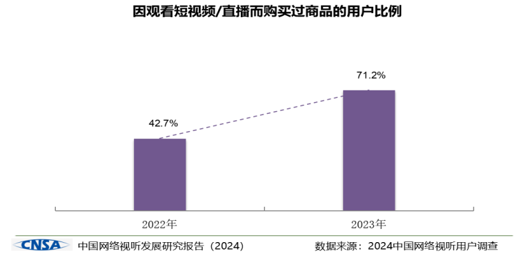 調查顯示,七成以上用戶因看短視頻/直播購買商品,超四成用戶認為短視頻/直播已成為主要消費渠道。其中,53.7%的用戶經常收看電商直播/直播帶貨,較2022年(30.3%)增加23.4個百分點,增速最快。而最近半年,用戶經常收看旅游/風景類短視頻的比例為44.4%,較2022年(28.1%)提升了16.3個百分點,從第十名躍升至第四名。