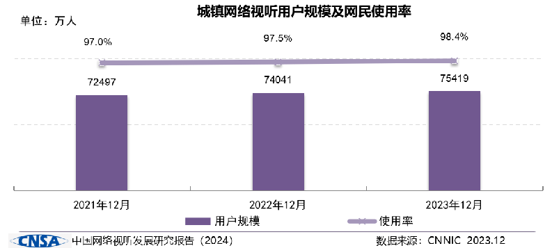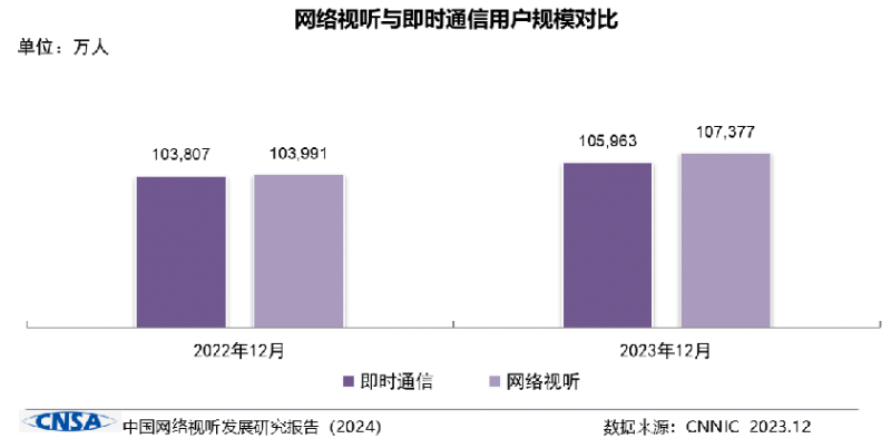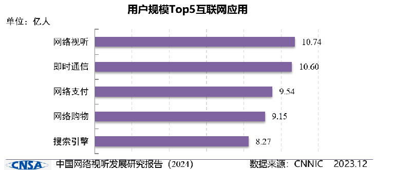 截至2023年12月,我國網絡視聽用戶規(guī)模達10.74億,網民使用率為98.3%。值得注意的是,網絡視聽用戶規(guī)模與排在第二的即時通信之間的差距進一步拉大,領先優(yōu)勢從2022年的184萬人提升到2023年的1414萬人。