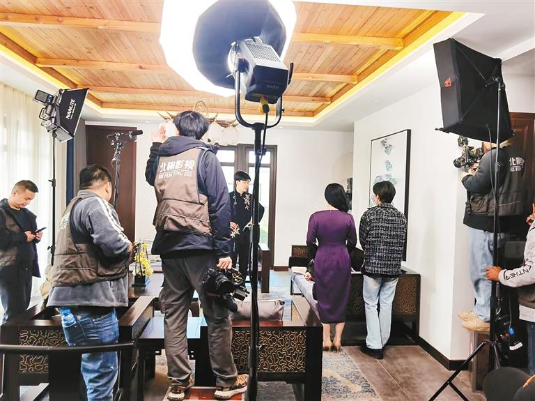 “雖然西安本地古裝微短劇的硬件設施比不過橫店,但都市類題材是西安的強項。西安城市界面的多元化為微短劇制作方提供了不少拍攝場景。比如W酒店、旭輝中心等高檔建筑的樓下隔三岔五就有‘霸道總裁’出沒。而西安奧體中心、四海唐人街、老菜場創(chuàng)意街區(qū)、宣平里、秦嶺里的高級民宿這種有特色的地點,也是不少微短劇的取景地。和記萬佳樓上的摩瑪夢想城婚紗攝影基地原本是一家婚紗照拍攝機構,如今已轉型成一家專業(yè)影棚,搭建了近20個特色場景,本地眾多微短劇制作方都愛在這里拍。幸福林帶商業(yè)區(qū)里的西安首家影視主題眾創(chuàng)空間——崠場數(shù)字影視服務平臺也是西安很多微短劇的拍攝首選場地。”剛于近期殺青了一部微短劇的陜西北楓文化傳媒有限公司負責人北楓導演向記者介紹了幾處西安較為有代表性的微短劇拍攝地點。“作為一家在西安耕耘多年的影視公司,我們抓住了微短劇的風口,籌備開拍了多部微短劇。西安演員市場成熟、拍攝場景豐富,發(fā)展微短劇產業(yè)十分有優(yōu)勢。”北楓說道。