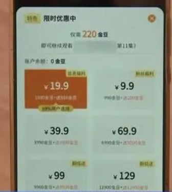 記者在“青禾短劇”小程序上觀看了一部80集的熱播短劇,在免費(fèi)觀看了9集后屏幕彈出付費(fèi)鏈接頁(yè)面。連接頁(yè)面頂端標(biāo)明“本集需付費(fèi)150金豆”,下方則顯示各種繳費(fèi)兌換標(biāo)準(zhǔn)。記者算了一筆賬發(fā)現(xiàn),按照150金豆可以觀看一集計(jì)算(每集觀看所需金豆有時(shí)是不一樣的),根據(jù)提示花39元購(gòu)買的3900個(gè)金豆只能看26集。想要看完這部短劇消費(fèi)者需要花費(fèi)117元。