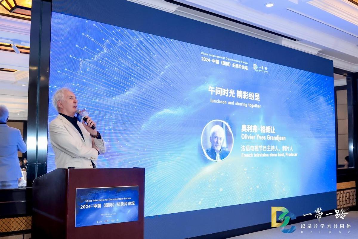 本次論壇特設了午間交流分享會這一特殊環(huán)節(jié)。中國傳媒大學校長張樹庭致辭,提出以紀實影像為代表的視聽媒介正在文化傳承與文明互鑒方面發(fā)揮積極作用。面對深刻的世界之變、時代之變、歷史之變,文化的交流與理解顯得尤為重要。紀錄片和國際傳播是連接不同文明的重要橋梁,希望本次論壇能夠推動未來更多有意義的項目合作,幫助人們從不同文明中尋求智慧、汲取營養(yǎng),攜手解決人類共同面臨的各種挑戰(zhàn)。中國日報社視覺中??級編輯李旻和清華?學影視傳播研究中?主任、教授雷建軍通過具體的媒介實踐作品切實展示真實記錄的魅力。法語電視節(jié)目主持?、制片?奧利弗·格朗讓(Olivier Yves Grandjean)生動幽默的表達了對中國文化和真實的中國形象的熱愛,同時介紹了自己寫作的圖書《生活在中國》。
