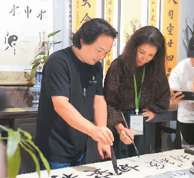 巴西泰坦尼制作有限公司制作人莉莉安娜·羅查·卡瓦薩(右)在廣東珠海北山社區(qū)體驗(yàn)書法。