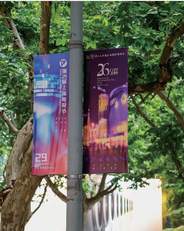 淮海中路上掛滿本屆上海國(guó)際電影節(jié)的宣傳道旗。 本報(bào)記者 王竟成 攝