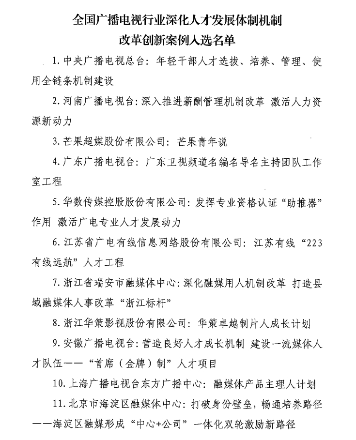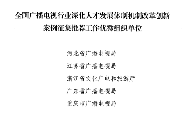 為深入學(xué)習(xí)貫徹習(xí)近平總書記關(guān)于做好新時代人才工作的重要思想,及時總結(jié)推廣人才發(fā)展體制機制改革中的典型做法和先進經(jīng)驗,國家廣播電視總局開展了全國廣播電視和網(wǎng)絡(luò)視聽行業(yè)深化人才發(fā)展體制機制改革創(chuàng)新案例征集評選工作。各級廣播電視行政部門和機構(gòu)對本次工作高度重視,在廣泛征集的基礎(chǔ)上,推薦報送了一批具有典型代表性和借鑒意義的創(chuàng)新案例。廣電總局經(jīng)專家評審等程序,確定“中央廣播電視總臺:年輕干部人才選拔、培養(yǎng)、管理、使用全鏈條機制建設(shè)”等11個案例為入選案例,現(xiàn)予以公布。同時,對征集推薦工作中表現(xiàn)突出的河北省廣播電視局等5家優(yōu)秀組織單位予以通報表揚。