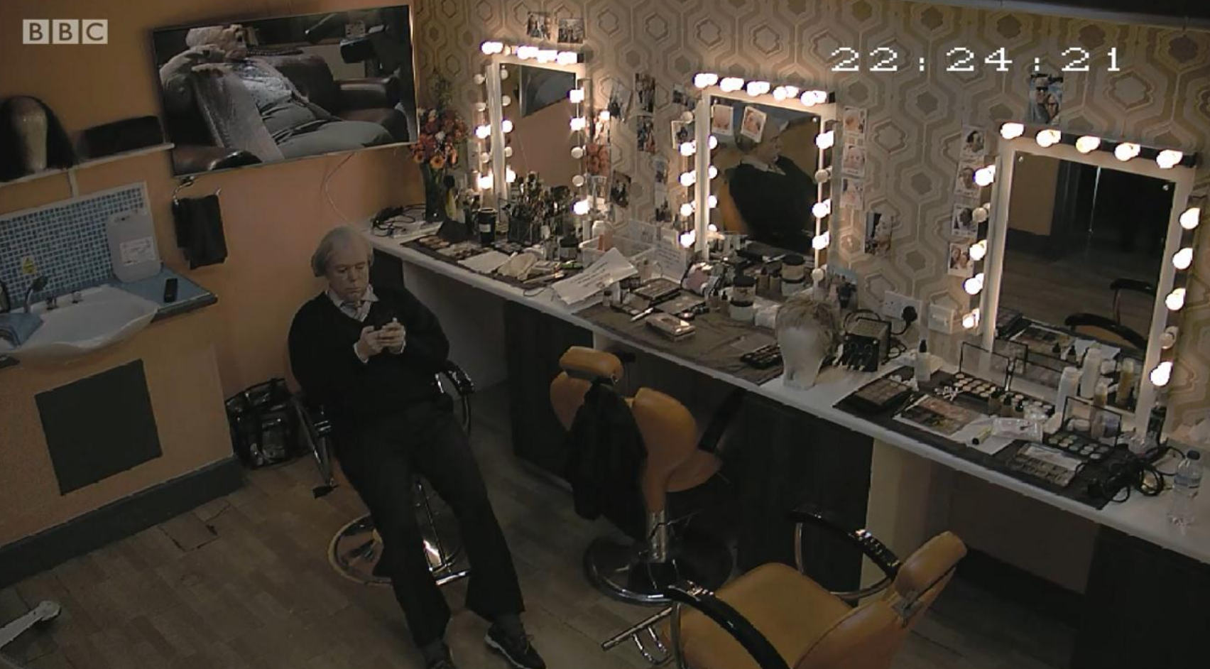 “9號空間”的候場和轉(zhuǎn)場區(qū)域復(fù)制了劇集中的《桑澤巴酒店》,濃綠墻面環(huán)繞的幽暗空間制造隱隱不安的懸疑感。史蒂夫剛踏入這個空間時,玩笑著說:“我這會兒心里怕怕的。”可當(dāng)他看到墻上掛滿的九季里不同劇集的劇照,露出了慈父般的表情,溫柔地凝視著那些定格的場景。在演出前為兩位編劇安排的布景導(dǎo)賞中,里斯看到道具的烘培手套,立刻戴起來拍了張照,這件小物把他一瞬間帶回第四季第三集的拍攝現(xiàn)場。