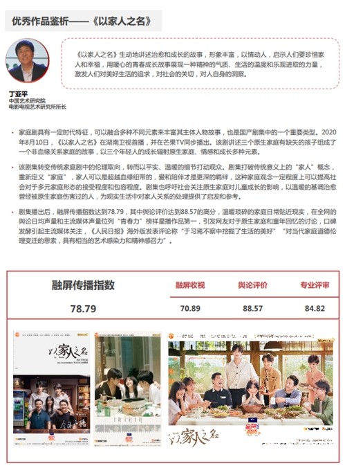 由芒果TV播出的《以家人之名》榮獲“年度優(yōu)秀劇集”。2020年8月10日,《以家人之名》播出后,融屏傳播指數達到78.79,其中輿論評價得到88.57的高分,溫暖瑣碎的家庭日常貼近現實,在全網的輿論日均聲量和主流媒體聲量位列前茅,引發(fā)網友對于原生家庭和童年回憶的討論,其口碑的發(fā)酵也引起了主流媒體關注,《人民日報》海外版發(fā)表評論稱其“于習焉不察中挖掘生活的美好”。活動專家評審之一,中國藝術研究院電影電視研究所所長丁亞平表示:“(作品)生動地講述治愈和成長的故事,形象豐富,以情動人,啟示人們要珍惜家人和幸福,用暖心的青春成長故事展現一種精神的氣質、生活的溫度和樂觀進取的力量,激發(fā)人們對美好生活的追求,對社會的關切,對人自身的洞察。”