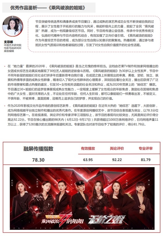 在芒果TV自制綜藝中,有三部優(yōu)秀綜藝——《乘風破浪的姐姐第一季》《朋友請聽好》《密室大逃脫第二季》榮獲“環(huán)球推薦綜藝”。其中,在綜藝創(chuàng)新上,芒果TV在2020年創(chuàng)造的現象級 “她綜藝”《乘風破浪的姐姐》,成為網絡視頻平臺獨立制作和播出的優(yōu)秀代表作,也在本次年度評選中奪得新競原創(chuàng)網絡綜藝的冠軍。在收視表現、輿論評價和專家評審三項指標上,該節(jié)目的表現在同類節(jié)目中也最為亮眼,均排名第一。在核心播出期的98天內(6月12 日-9月17日)共獲得超過1000萬條網絡評價,日均網絡聲量在11萬以上,獲得了5283篇次的主流媒體報道。本屆活動的專家團隊也對該節(jié)目給予了較高的評價,中國藝術研究院電影電視研究所高級編輯支菲娜認為:“節(jié)目突破傳統(tǒng)選秀和偶像養(yǎng)成類節(jié)目窠臼,通過成熟的演藝界成功女性不斷突破自我的過程,展示了女性敢于開拓前行的魅力與風采,喚起積極向上的力量,掀起了全民‘乘風破浪’熱潮,成為一檔現象級綜藝節(jié)目。”