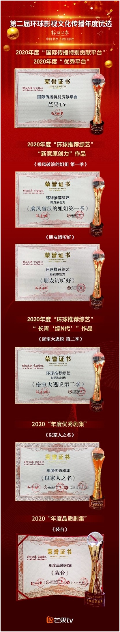 近日,由環(huán)球時報社主辦,中國廣播電視社會組織聯合會電視制片委員會、電視劇導演委員會、演員委員會聯合主辦的第二屆“時代旋律 家國情懷——環(huán)球影視文化傳播高峰論壇暨年度優(yōu)選”在人民日報社成功舉行?;顒由?,環(huán)球時報輿情中心發(fā)布《環(huán)球輿情·2020年影視文化傳播評估報告》(以下簡稱《報告》),介紹研究方法與評估標準,解讀研究結論與相關數據,并與中廣聯制片委、導演委、演員委正式揭曉了根據評估研究產生的推優(yōu)名單,公布了眾多在跨屏融媒體傳播過程中產生的優(yōu)秀影視作品、制播機構、文藝工作者等。其中,芒果TV及由其參與制作及播出的多部電視劇、綜藝作品均榜上有名!