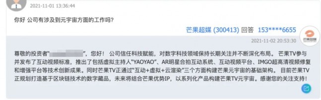 11月2日晚間,芒果超媒在互動(dòng)易平臺(tái)上回答投資者提問時(shí)表示:公司信任科技賦能,對(duì)數(shù)字科技領(lǐng)域保持長期關(guān)注并不斷深化布局。芒果TV參與并發(fā)布了互動(dòng)視頻標(biāo)準(zhǔn),推出了包括虛擬主持人“YAOYAO”、AR明星合拍互動(dòng)系統(tǒng)、互動(dòng)視頻平臺(tái)、IMGO超高清視頻修復(fù)和增強(qiáng)平臺(tái)等技術(shù)創(chuàng)新成果。同時(shí),芒果TV正通過“互動(dòng)+虛擬+云渲染”三個(gè)方面構(gòu)建芒果元宇宙的基礎(chǔ)架構(gòu)。目前芒果TV正規(guī)劃打造基于區(qū)塊鏈技術(shù)的數(shù)字藏品,未來將結(jié)合芒果優(yōu)勢(shì)IP,以系列化產(chǎn)品構(gòu)建芒果TV元宇宙。