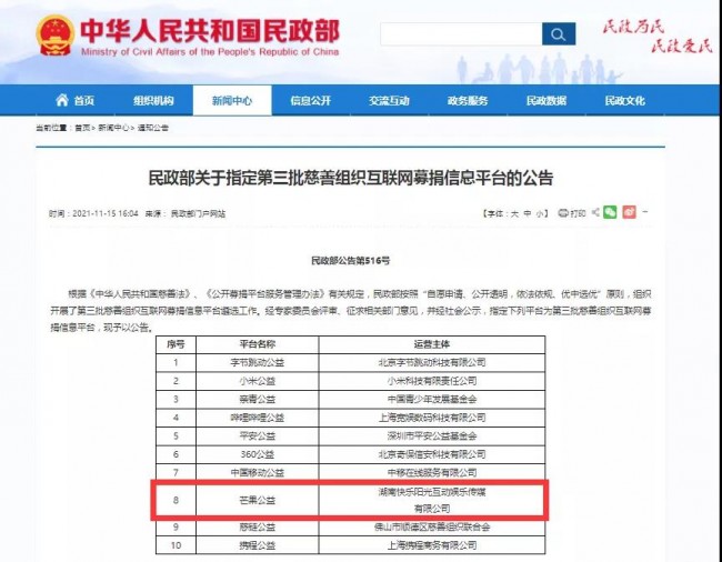 11月15日,中華人民共和國(guó)民政部發(fā)布《民政部關(guān)于指定第三批慈善組織互聯(lián)網(wǎng)募捐信息平臺(tái)的公告》。芒果TV(湖南快樂(lè)陽(yáng)光互動(dòng)娛樂(lè)傳媒有限公司)在此次遴選中入圍,獲得民政部指定,成為全國(guó)廣電系統(tǒng)范圍內(nèi)及湖南省內(nèi)唯一的慈善組織互聯(lián)網(wǎng)募捐信息平臺(tái)。截至目前,全國(guó)范圍內(nèi)共有30家互聯(lián)網(wǎng)募捐信息平臺(tái)。