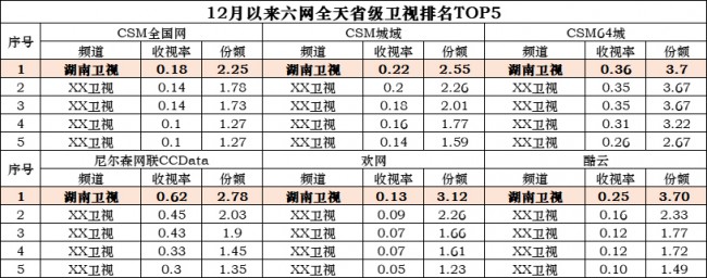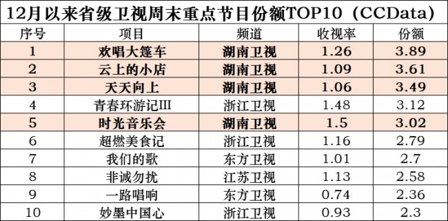 CCData數(shù)據(jù)顯示,12月以來(lái),湖南衛(wèi)視在省級(jí)衛(wèi)視周末節(jié)目收視前十榜單前五中占據(jù)四席,《時(shí)光音樂(lè)會(huì)》為收視率最高的項(xiàng)目,《歡唱大篷車(chē)》穩(wěn)定居于份額榜首。