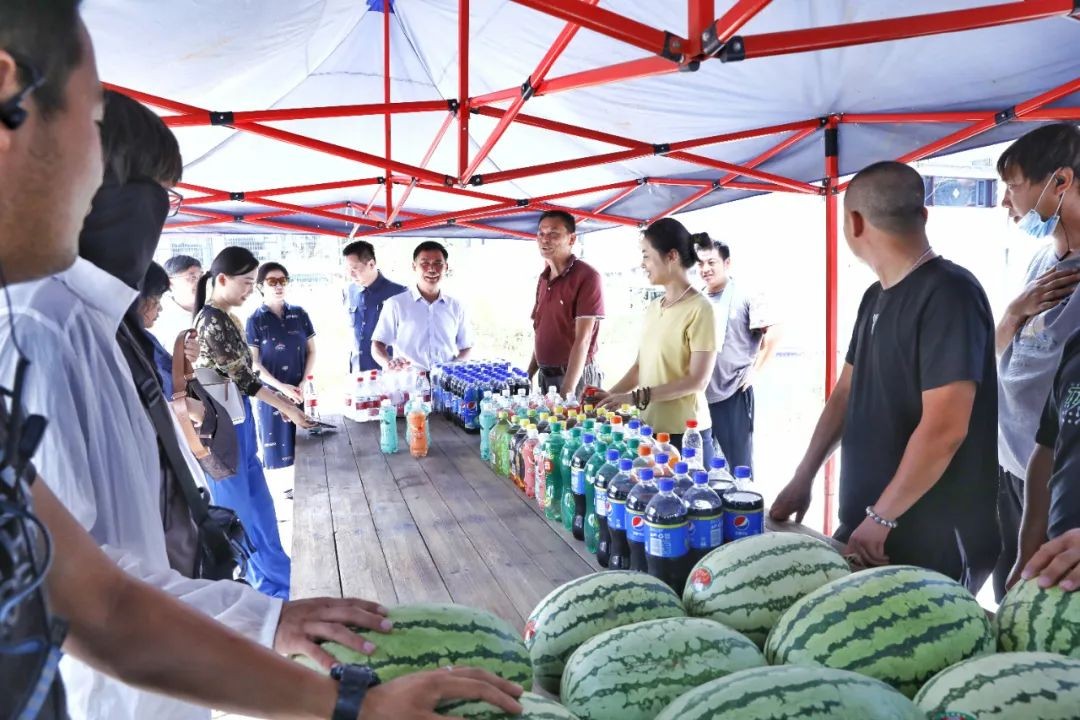 探班過程中,吳擁軍、劉永平代表集團(tuán)向劇組送上了西瓜、飲料等防暑降溫物資,并叮囑大家要做好高溫下的自我防護(hù),用真誠、真情力創(chuàng)精品,預(yù)祝影片拍攝順利、票房大賣。