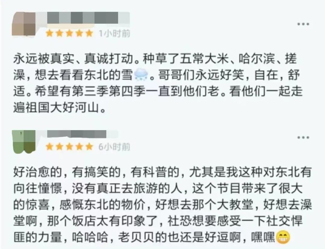 “格局”、“煙火”、“助農(nóng)”、“治愈”等關(guān)鍵詞成為了節(jié)目?jī)r(jià)值和理念的代名詞,節(jié)目通過(guò)東北的美食、旅游、糧倉(cāng)、洗浴等文化維度,讓不少外地觀眾產(chǎn)生旅游向往。有網(wǎng)友評(píng)價(jià)“希望可以打造成一檔長(zhǎng)期的旅游節(jié)目。”本周,《快樂(lè)再出發(fā)》第二季第三期將繼續(xù)深入體驗(yàn)東北得天獨(dú)厚的自然環(huán)境,周四22:00鎖定湖南衛(wèi)視、芒果TV,一起暢享一段絲滑的冰上之旅!