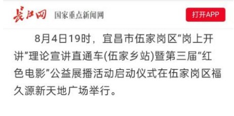 活動得到宜昌市委、伍家崗區(qū)委兩級宣傳部鼎力支持,活動稿件登錄人民日報客戶端、人民日報視頻客戶端、央視網(wǎng)、中國網(wǎng)、湖北日報、今日頭條、長江網(wǎng)、百度等10余家媒體平臺。