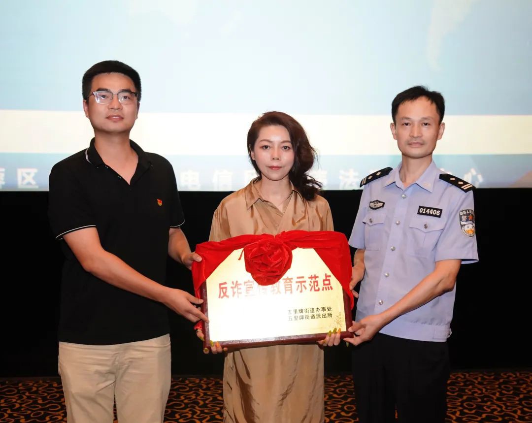 活動上,長沙市芙蓉區(qū)五里牌派出所副所長王朗和芙蓉區(qū)五里牌街道組宣委員黃明明為瀟湘國際影城長沙阿波羅店頒發(fā)了“反詐宣傳教育示范點”牌匾,這也是長沙市首家以反詐為主題的示范影院,構(gòu)建了“街道牽頭、民警指導、影院參與”的反詐示范新格局,掀起全民反詐的熱潮。