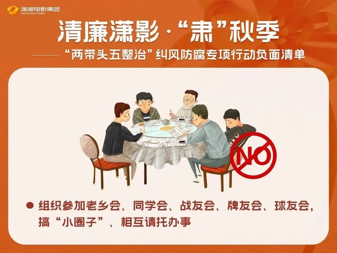 時(shí)至秋季,正值“兩帶頭五整治”糾風(fēng)防腐專項(xiàng)行動(dòng)全面開(kāi)展中,瀟影集團(tuán)緊扣違規(guī)吃喝、違規(guī)收送禮品禮金、違規(guī)旅游、打牌賭博、酒后駕車等方面,以漫畫形式呈現(xiàn)“兩帶頭五整治”負(fù)面清單,推出“清廉瀟影·‘肅’秋季”。