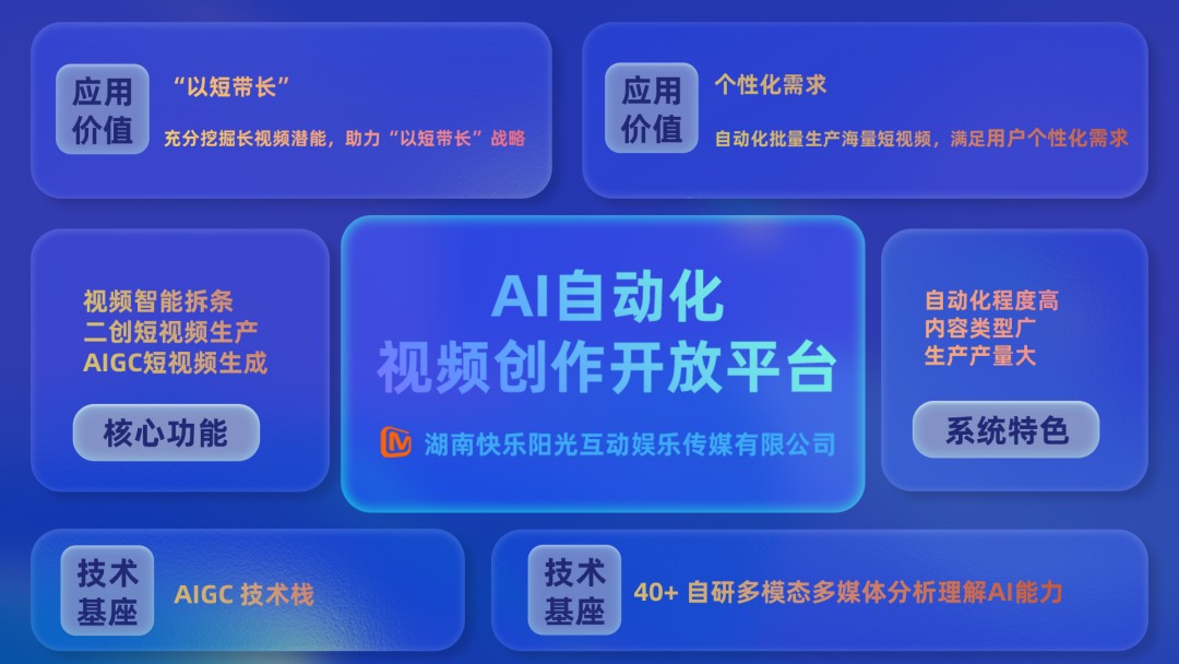 AI自動化視頻創(chuàng)作開放平臺是芒果TV自研的短視頻自動生產(chǎn)平臺,為挖掘湖南衛(wèi)視、芒果TV雙平臺海量長視頻寶藏,生成大量短視頻滿足海量用戶個性化需求,發(fā)揮短視頻與長視頻的聯(lián)動效應(yīng),AI自動化視頻創(chuàng)作開放平臺乘風而生。