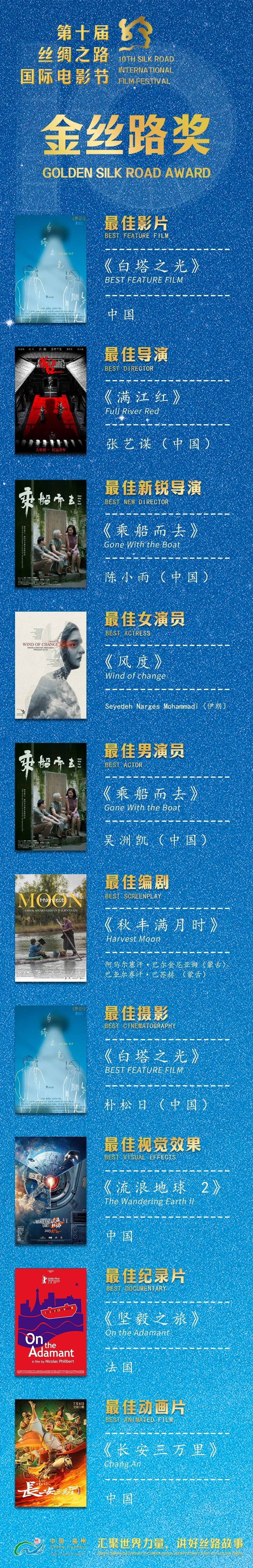9月27日晚,由中央廣播電視總臺(tái)、福建省人民政府、陜西省人民政府主辦的第十屆絲綢之路國(guó)際電影節(jié)在福建福州圓滿(mǎn)落幕,由瀟湘電影集團(tuán)聯(lián)合出品的電影《流浪地球2》最終捧獲最佳視覺(jué)效果獎(jiǎng)。據(jù)了解,本屆電影節(jié)共有來(lái)自50 多個(gè)國(guó)家的超千部影片報(bào)名參加主競(jìng)賽和展映單元,創(chuàng)歷屆之最,其中 500 多部作品參與獎(jiǎng)項(xiàng)角逐。經(jīng)層層評(píng)選,20 部作品最終入圍競(jìng)逐10項(xiàng)大獎(jiǎng)。 在當(dāng)晚的頒獎(jiǎng)典禮上,最佳影片獎(jiǎng)花落《白塔之光》,張藝謀憑借《滿(mǎn)江紅》成功斬獲最佳導(dǎo)演獎(jiǎng),伊朗電影《風(fēng)度》女主角Seyedeh Narges Mohammadi獲頒最佳女演員獎(jiǎng),《乘船而去》男主角吳洲凱獲頒最佳男演員獎(jiǎng),《流浪地球2》喜提最佳視覺(jué)效果獎(jiǎng),《長(zhǎng)安三萬(wàn)里》和《堅(jiān)毅之旅》分別獲得最佳動(dòng)畫(huà)片和最佳紀(jì)錄片殊榮。