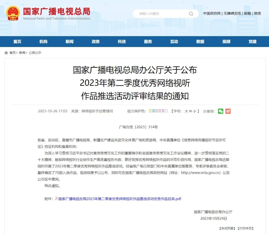 近日,國家廣播電視總局組織開展了2023年第二季度優(yōu)秀網(wǎng)絡(luò)視聽作品推選活動。經(jīng)省級廣電行政部門和中央直屬單位等推薦,專家評審委員會審核,最終確定了78部入選作品。