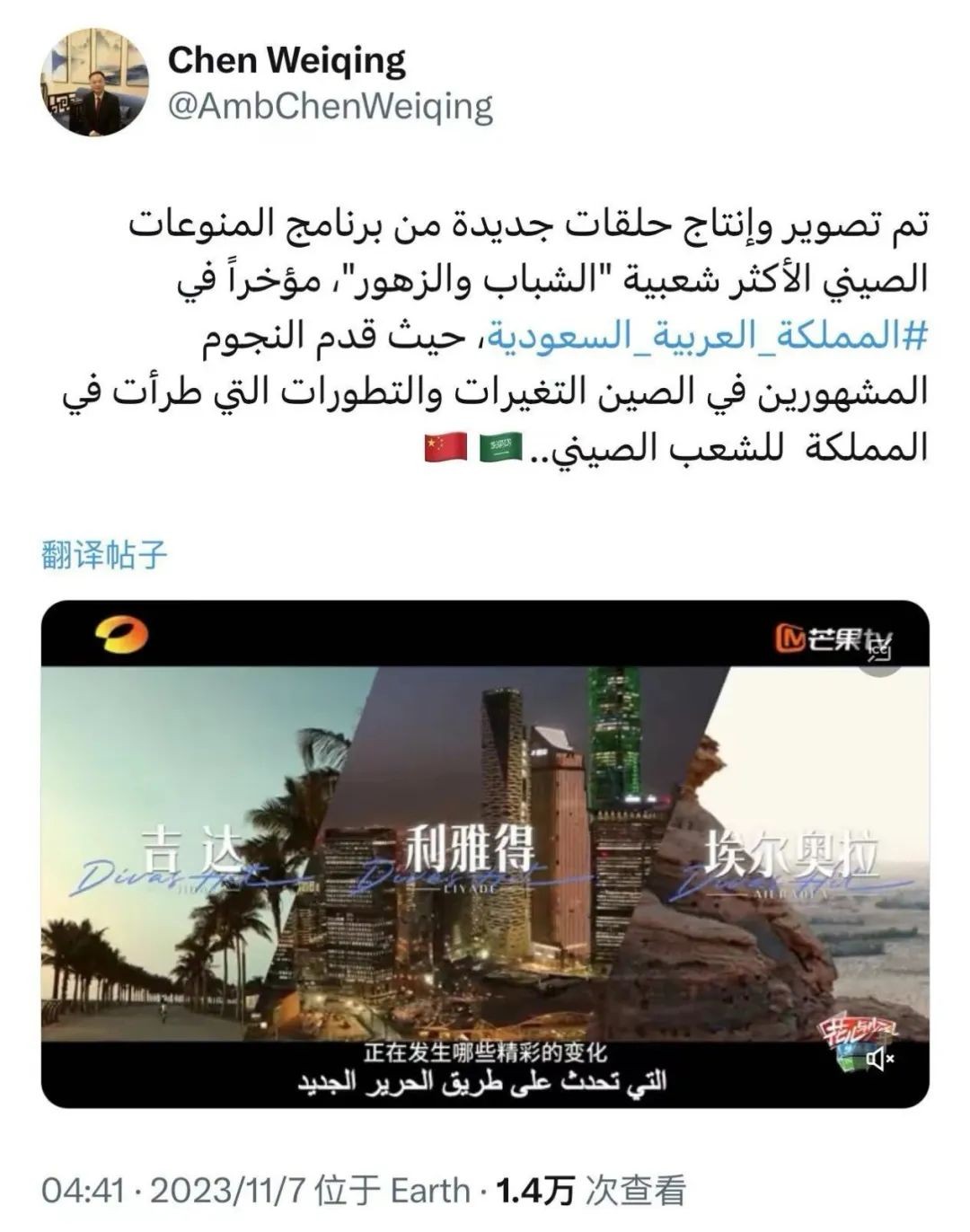 11月7日,中國(guó)駐沙特大使陳偉慶在國(guó)際社交平臺(tái)發(fā)布《花兒與少年·絲路季》雙語(yǔ)宣傳片,并配文稱(chēng):“中國(guó)最火爆的綜藝節(jié)目《花兒與少年》在沙特拍攝制作完成,中國(guó)藝人向中國(guó)民眾介紹了沙特的變化和發(fā)展。”推文發(fā)布后獲得海外網(wǎng)友紛紛點(diǎn)贊和轉(zhuǎn)發(fā)。沙特網(wǎng)友@abdullahksa2022 留言道,“我們看到了兩國(guó)的友好交往,中國(guó)的進(jìn)步、繁榮一直都是我們值得效仿的榜樣,祝兩國(guó)的友誼巨輪揚(yáng)帆遠(yuǎn)航!”