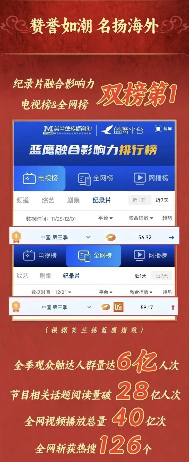 開播三年以來,紀(jì)錄片《中國》全網(wǎng)曝光量高達(dá)76.56億次,全網(wǎng)熱搜181個,累計上榜時長2481.1小時。其中,微博累計曝光量55.4億人次,抖音、快手、B站等視頻平臺累計播放量11.6億次,全網(wǎng)觸達(dá)人群量高達(dá)13.1億人次。三季網(wǎng)絡(luò)融合傳播指數(shù),在播出期皆位列全網(wǎng)熱播紀(jì)錄片第一,美譽度最高達(dá)99.97(根據(jù)美蘭德藍(lán)鷹指數(shù))。《人民日報》、新華社、《光明日報》、《中國日報》等權(quán)威媒體的頻頻點贊,更吸引各級黨政媒體報道1605條,主流媒體報道1.8萬條。