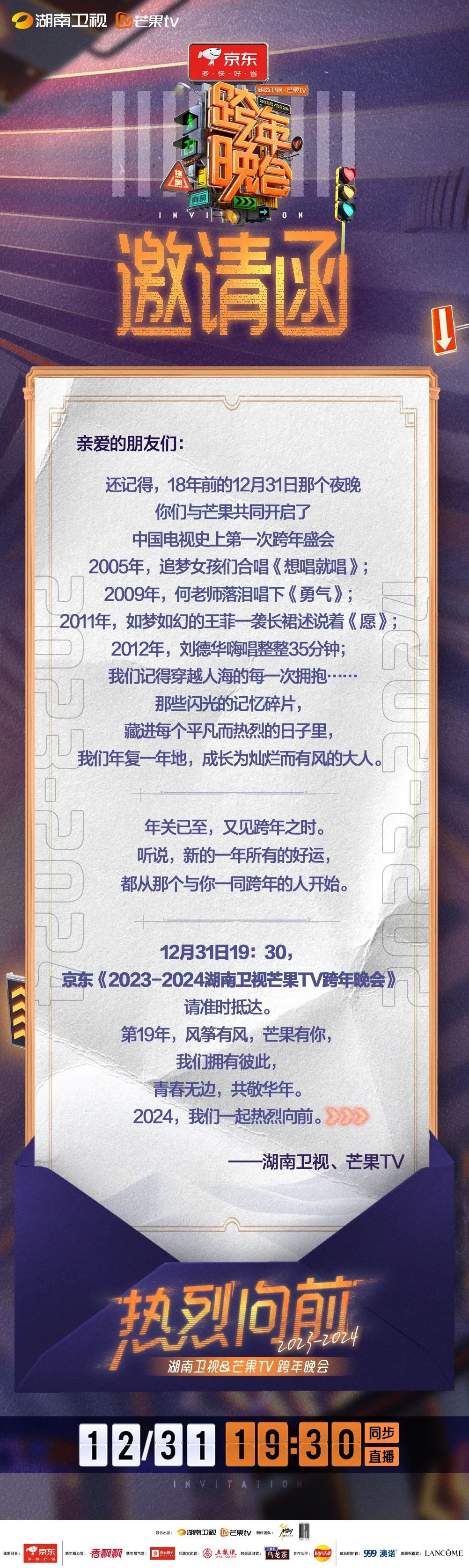 “陪伴”的主題在2023-2024年湖南衛(wèi)視芒果TV的跨年舞臺(tái)上歷久彌新,芒果跨年品牌能夠屹立19年的秘訣,就是全國觀眾的支持和陪伴,這份深厚的感情在今年的舞臺(tái)上將雙向奔赴。據(jù)悉,“零點(diǎn)特別設(shè)計(jì)”將有一個(gè)專屬于湖南衛(wèi)視觀眾的超大驚喜,19年的陪伴厚愛在2024年1月1日的零點(diǎn)萬眾矚目,誰會(huì)是這個(gè)“芒果終身摯友”呢?同時(shí),為了感謝全國觀眾,下載京東APP即可領(lǐng)取10億紅包和千萬份好禮,芒果TV會(huì)員也將在2023年12月15日至27日推出“芒果跨年熱烈街區(qū)”“跨海跨年,??谌谴蚩?rdquo;兩大玩法,為廣大觀眾、用戶準(zhǔn)備晚會(huì)入場券等40+種類、17萬份跨年禮包,讓每一位觀眾真正成為這場盛宴的主角。