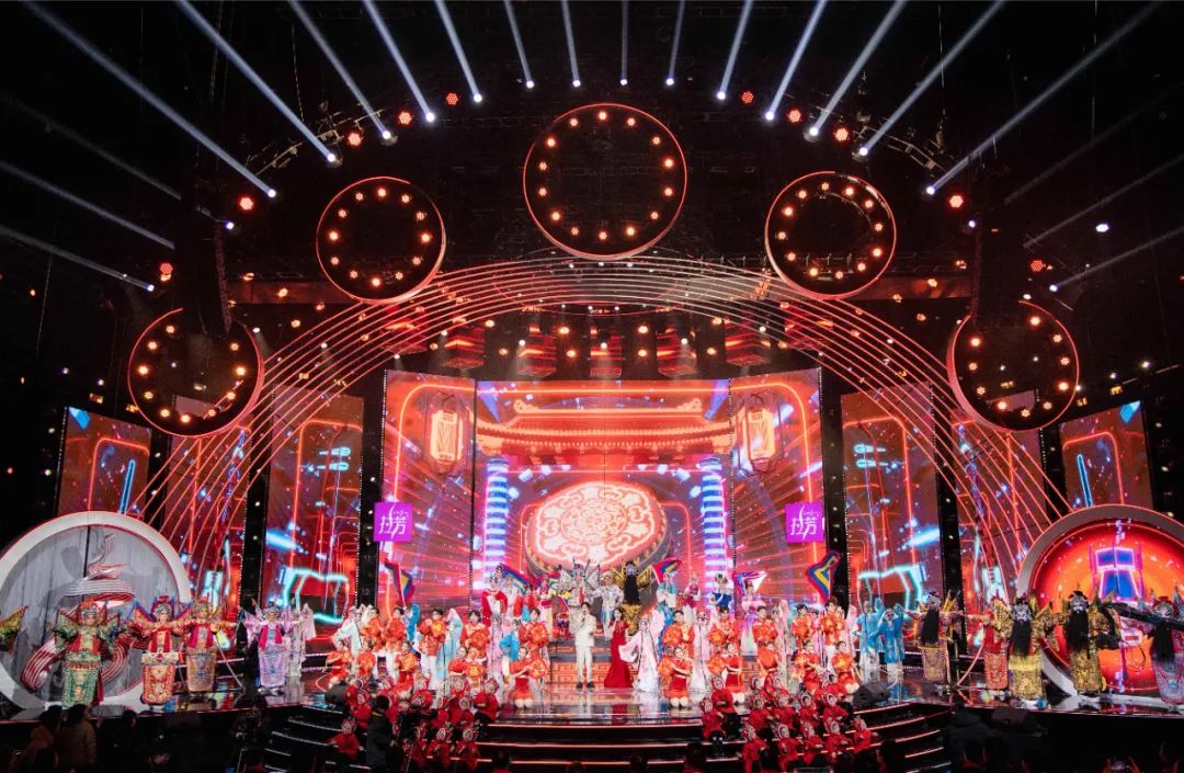 珠光靚麗的盔頭是戲曲中重要的標(biāo)識(shí)性色彩,盔頭隨著戲曲演員的翻滾撲跌、閃轉(zhuǎn)騰挪,通常呈現(xiàn)出流動(dòng)溢彩之色。但,你能想象把傳統(tǒng)戲曲盔頭和現(xiàn)代化元素結(jié)合起來(lái)的樣子嗎?這次晚會(huì)舞美設(shè)計(jì)的靈感便是將戲曲盔頭融入在現(xiàn)代的舞臺(tái)設(shè)計(jì)中。用抽象化與放大的頭飾形狀形成了舞臺(tái)的主體結(jié)構(gòu),用可控麥爵士燈來(lái)展示頭飾的瑰麗與變化。在科技的創(chuàng)新手法加持下,現(xiàn)代化元素悄無(wú)聲息地將戲曲的寫(xiě)意之美展現(xiàn)得淋漓盡致。