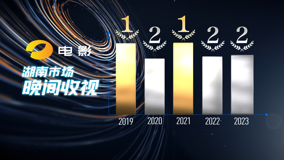湖南電影頻道2019年-2023年湖南晚間收視排名,數(shù)據(jù)來(lái)源:CSM,4+,湖南(全省)(M),18:00—24:00