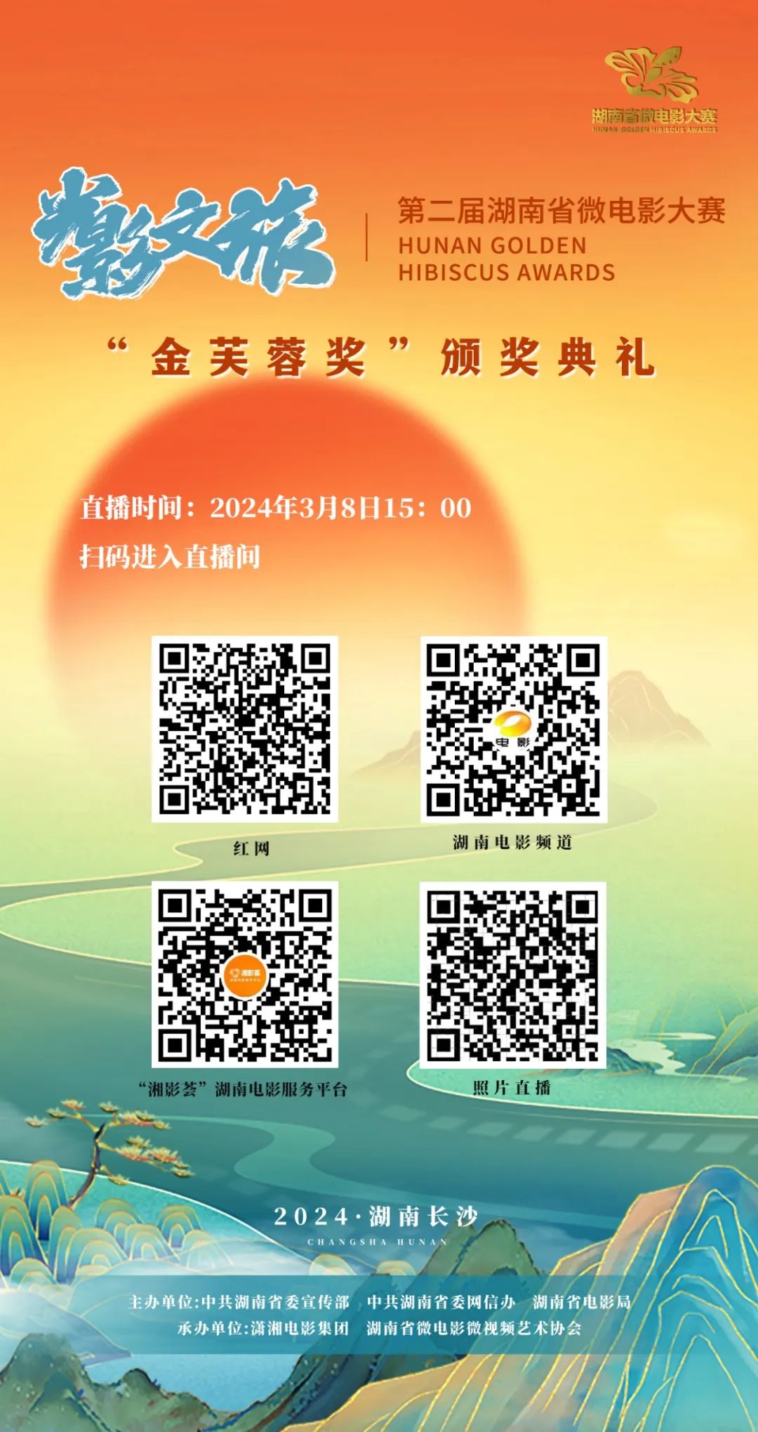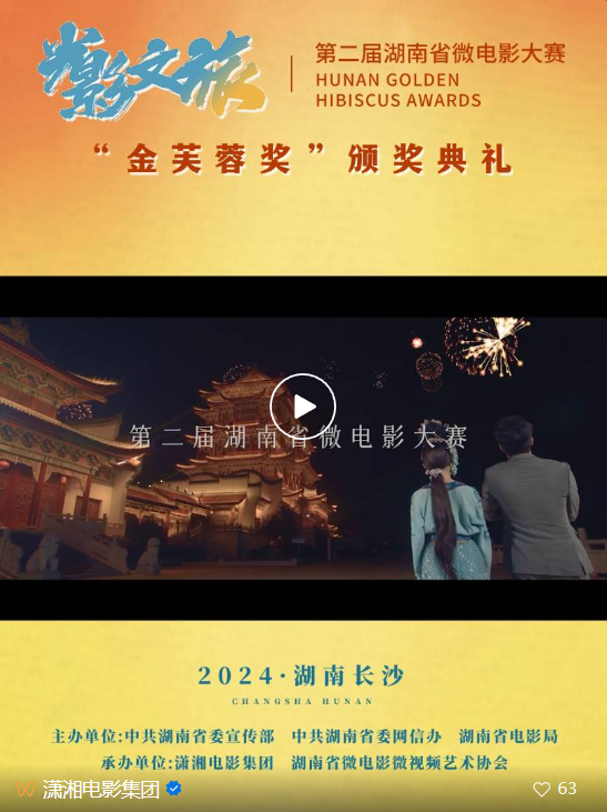 由中共湖南省委宣傳部、中共湖南省委網信辦、湖南省電影局聯(lián)合主辦,瀟湘電影集團、湖南省微電影微視頻藝術協(xié)會承辦的“光影文旅”第二屆湖南省微電影大賽“金芙蓉獎”頒獎典禮將于3月8日下午15點在湖南長沙舉行。來自全省各地的微電影創(chuàng)作者與愛好者們將齊聚一堂,共話電影,共襄盛舉。