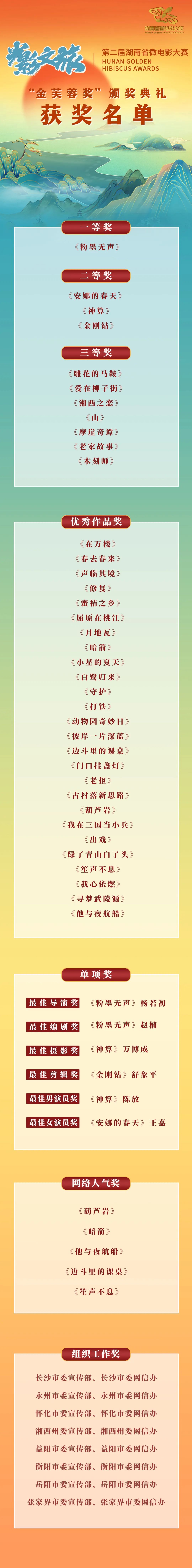 為宣傳推廣本屆大賽成果,表彰激勵(lì)獲獎(jiǎng)的優(yōu)秀作品、先進(jìn)個(gè)人及創(chuàng)作組織單位,大賽組委會后續(xù)將通過湖南電影頻道、湖南農(nóng)村院線、紅網(wǎng)時(shí)刻、大賽官方小程序、“湘影薈”湖南電影服務(wù)平臺等開展優(yōu)秀作品線上線下展映展播活動。