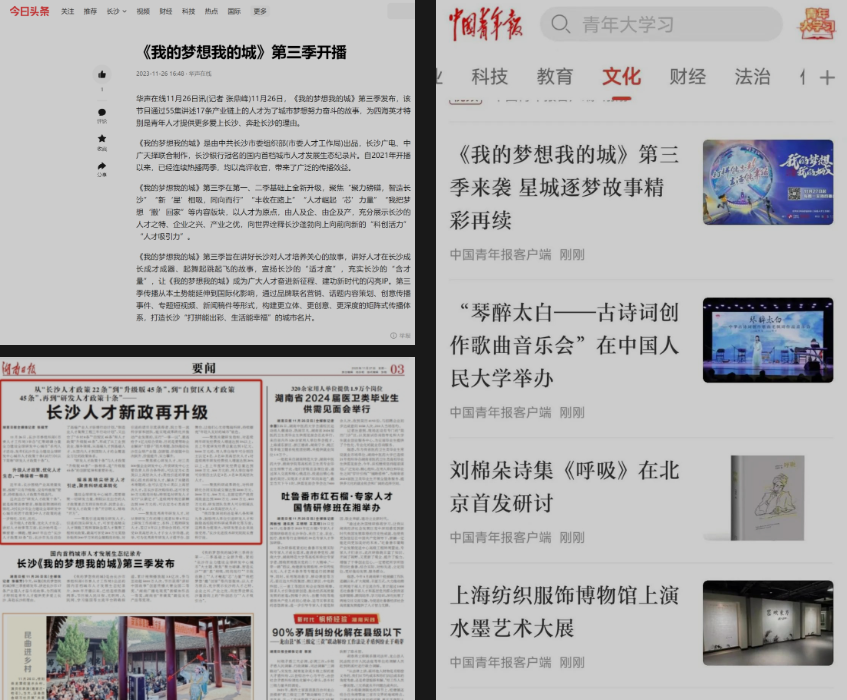 《我的夢想我的城》第三季由中共長沙市委組織部(市委人才工作局)出品,長沙廣電、中廣天擇聯(lián)合制作,長沙銀行冠名。自2023年11月27日開播以來,反響熱烈,截至目前,節(jié)目全網(wǎng)互動曝光量超3.6億人次,“長沙人才星夢想”視頻號上播放互動量累計達(dá)210萬次。單集視頻《先導(dǎo)片》《雙城一夢》《“客串”人生》《歸“航”》《綻放》均為10萬+爆款內(nèi)容。先后獲學(xué)習(xí)強國、中國青年報、中新網(wǎng)、中國網(wǎng)、鳳凰網(wǎng)、新湖南、今日頭條、華聲在線等60多家主流媒體聚焦報道,全面展現(xiàn)長沙“愛才”形象,助推長沙引才、留才工作。