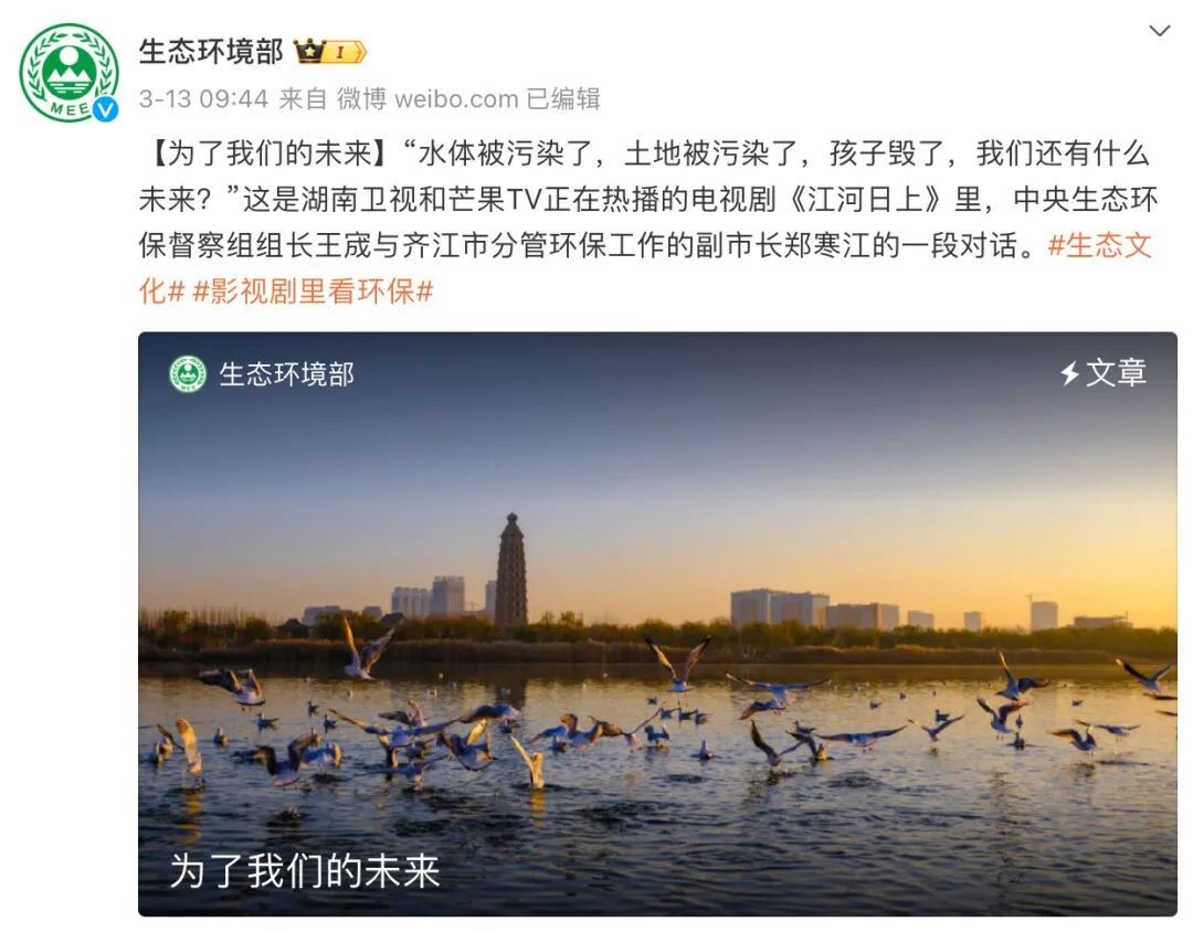 踐行環(huán)保初心,肩負時代使命。《江河日上》以真實的環(huán)保案例為創(chuàng)作素材,創(chuàng)新環(huán)保的內容表達,在嚴肅的命題下加入“輕喜”元素,構建環(huán)保題材的情感鏈接,用生動的環(huán)保故事和高揚的環(huán)保立意,擘畫踐行綠色發(fā)展之路的進程與展望,獲得生態(tài)環(huán)境部的發(fā)文認可:“是一部能深刻折射現實關照與反映現實生活的優(yōu)秀影視作品”“彰顯了文學界對于生態(tài)文明建設的文化自覺和文化自信”,劇集在播出期間還收獲了100+地方生態(tài)環(huán)境藍V矩陣的互動支持。