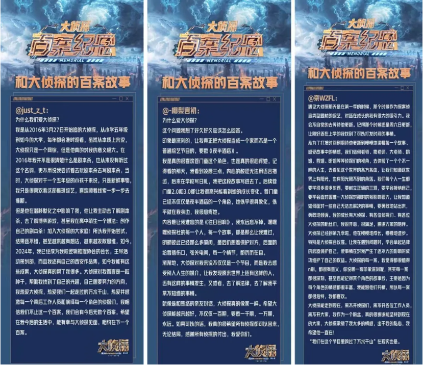 第九季第一案開(kāi)始,大偵探官微發(fā)布的每一期案件海報(bào)都標(biāo)注著“MZ100” “MZ99”等百案倒計(jì)時(shí)彩蛋,每周的播前劇透策劃也暗藏著倒計(jì)時(shí)相關(guān)線索。在第100案的會(huì)員加更內(nèi)容中,節(jié)目將從100案到第1案的集體畫(huà)面做出整理,這些“蛛絲馬跡”,是我們與觀眾的共同暗號(hào),也是向百案長(zhǎng)情陪伴的致敬。