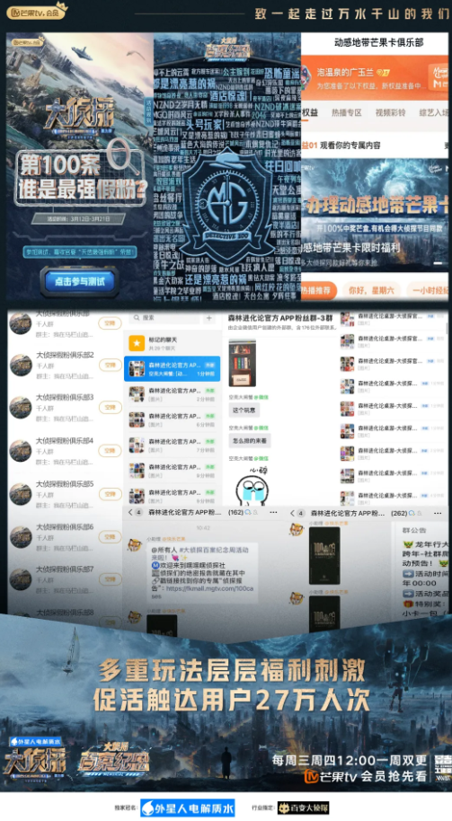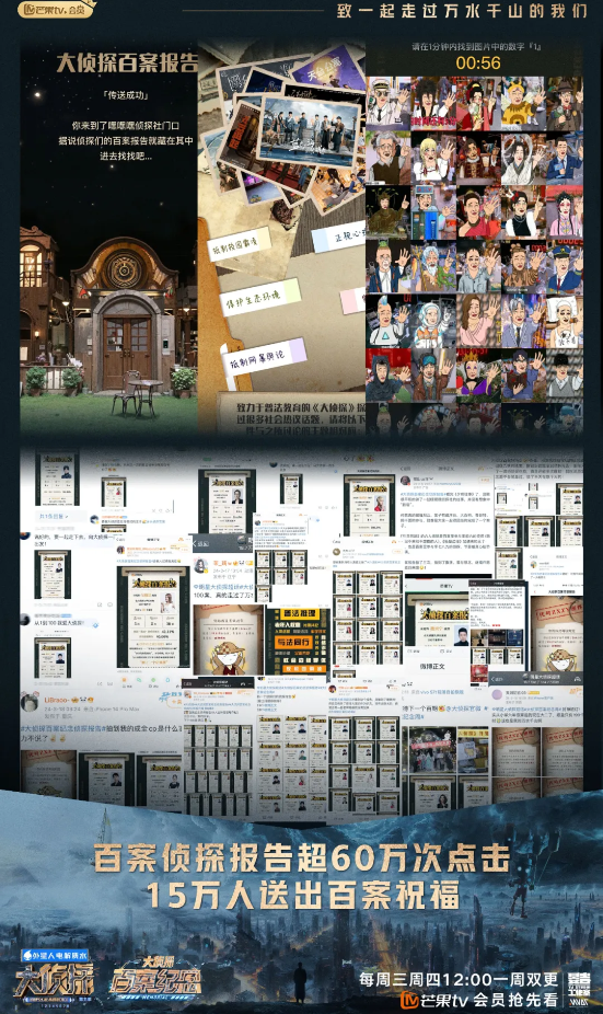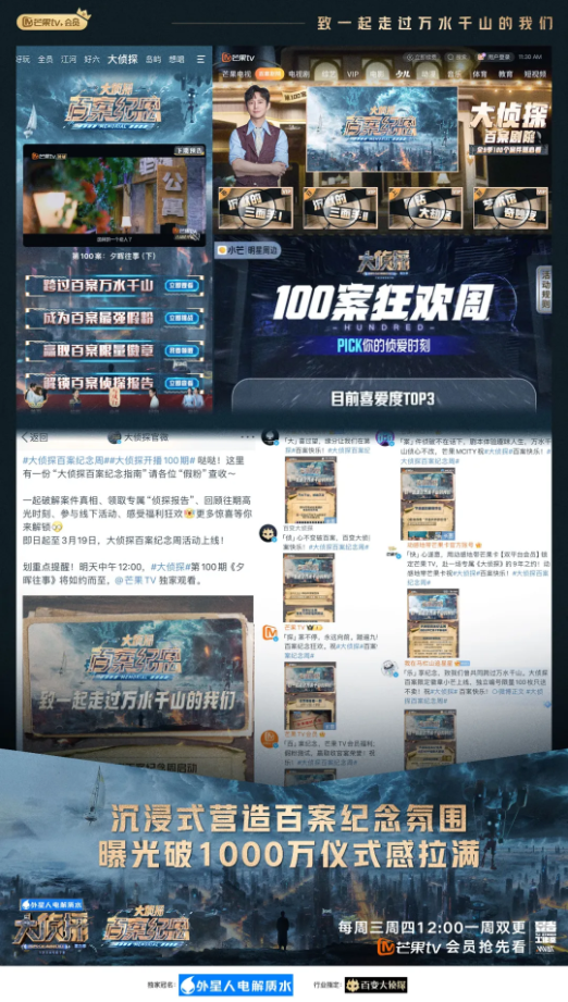 3月12日,在“大偵探百案紀(jì)念周”正式啟動(dòng)當(dāng)天,芒果TV站內(nèi)外各業(yè)務(wù)線送上令人意想不到的驚喜,@芒果TV @芒果TV會(huì)員 @芒果互娛 @小芒電商 @動(dòng)感地帶芒果卡官方賬號(hào) @外星人電解質(zhì)水 @百變大偵探 等七大官微聯(lián)合官宣,在@大偵探官微 下,以巧妙的藏頭詩(shī)組成“大偵探百案快樂(lè)”的文案并送上紀(jì)念祝福,場(chǎng)面溫馨熱鬧,這是令人暖心的儀式感。