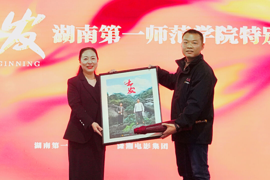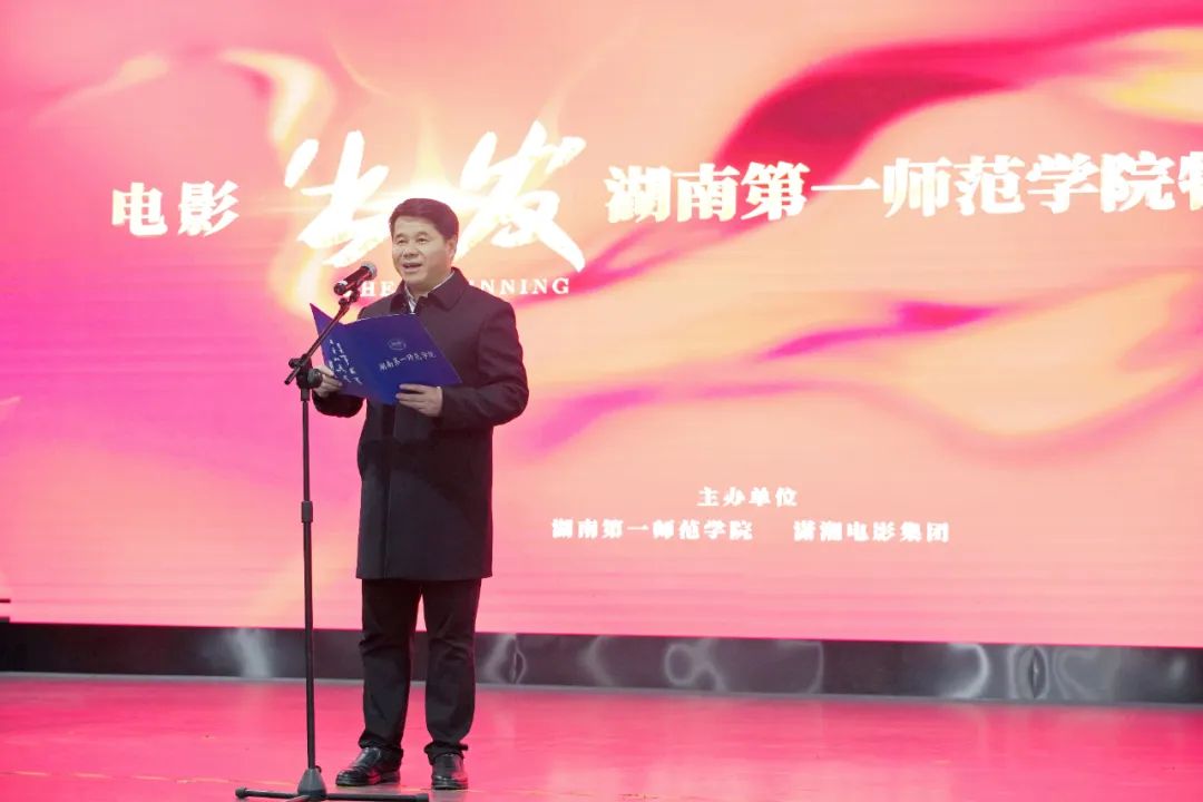 活動現(xiàn)場,湖南第一師范學(xué)院黨委委員、副校長周發(fā)明在致辭中表示,電影《出發(fā)》是對歷史的致敬和對未來的啟迪。湖南一師作為毛主席母校,作為青年毛澤東“出發(fā)”的地方,能夠見證和參與本片從開機到上映具有特殊意義。110年前,青年毛澤東來到第一師范求學(xué)期間,他的實地調(diào)查和深入民眾的游學(xué)實踐,展現(xiàn)了他對知識的渴求和對社會的深刻理解。其“身無分文,心憂天下”的愛國精神和千里游學(xué)求真知的奮斗精神也成為一筆珍貴的精神財富。